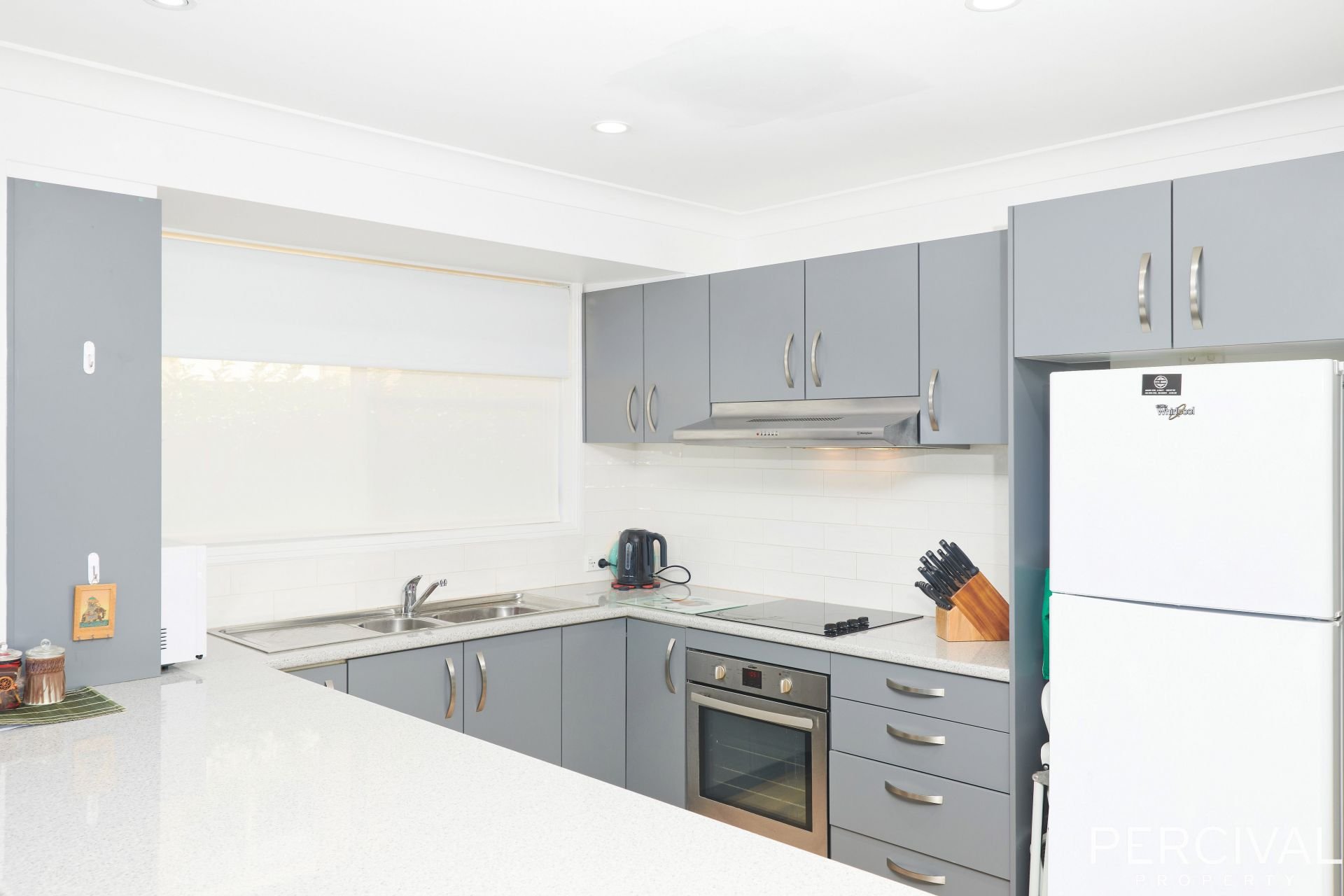 A modern well equipped kitchen includes stainless steel appliances, plenty of storage and a large breakfast bar.